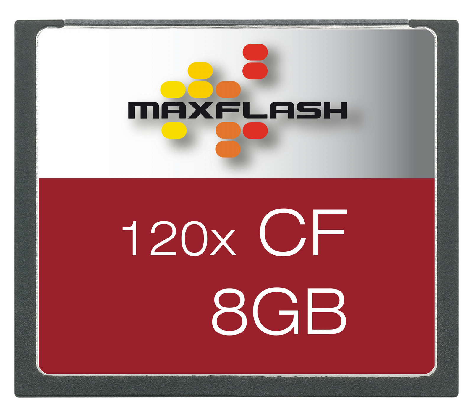 MaxFlash Compact Flash Card 8 GB. Емкость: 8 ГБ, Тип флэш-карты: CompactFlash, Скорость считывания: 20 МБ/с. Ширина: 42,8 мм, Глубина: 36,4 мм, Высота: 3,3 мм. Масса брутто: 26,4 г