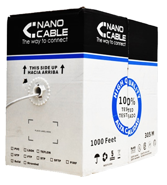 Nanocable 10.20.0304. Длина кабеля: 305 м, Стандарт кабеля: Cat5e, Экранирование кабеля: U/UTP (UTP). Ширина упаковки: 38 см, Глубина упаковки: 39 см, Высота упаковки: 25 см