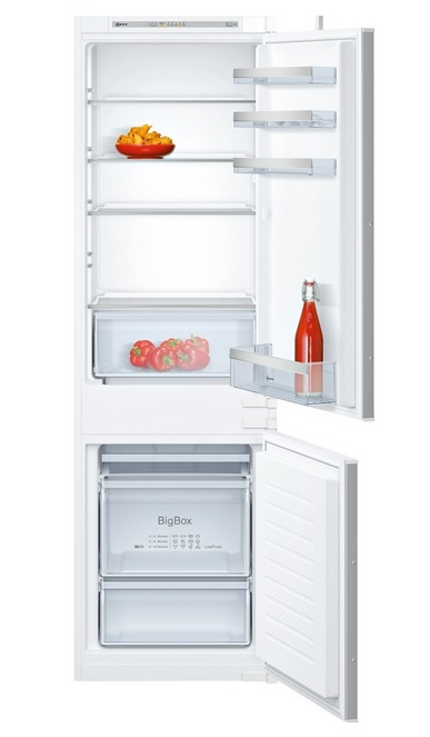 Neff KI5862S30. Тип корпуса: Встроенный, Цвет товара: Белый, Дверная петля: Справа. Суммарная полезная емкость: 276 л, Тип климата: SN-T, Уровень шума: 38 дБ. Полезная емкость холодильника: 191 л, Тип лампы: LED. Размещение морозильной камеры: Расположен снизу, Полезная емкость морозильной камеры: 76 л, Вместимость морозильной камеры: 3,5 кг/24ча. Класс энергоэффективности: A++, Подключенная нагрузка: 90 Вт, Годовое потребление энергии: 231 кВт·ч