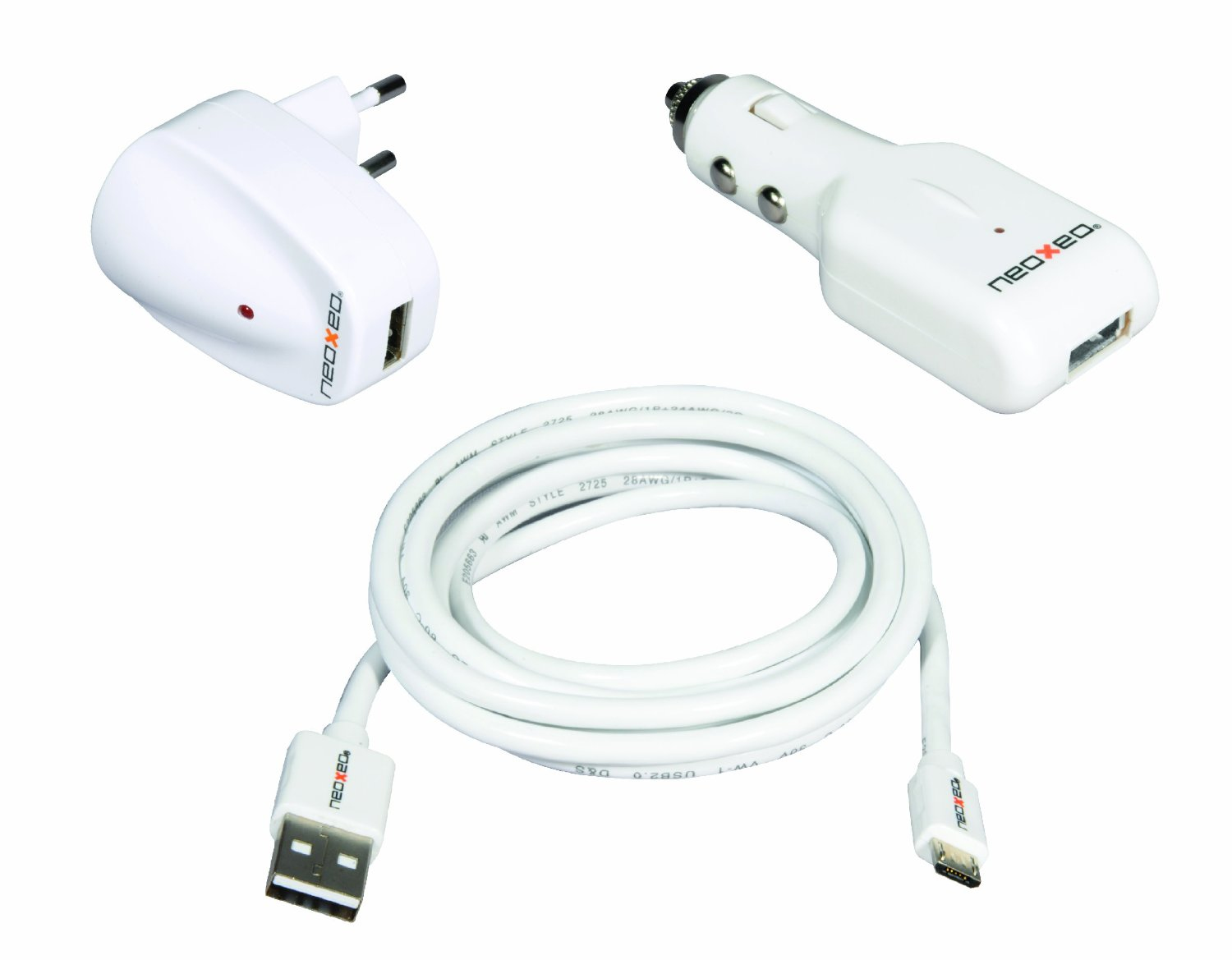 Neoxeo X250A25018. Тип зарядного устройства: Авто, Совместимые устройства: Смартфон, Тип источника питания: Прикуриватель. Цвет товара: Белый, Длина кабеля: 1,5 м. Выходной ток адаптера: 2,1 А. Поставляемые кабели: Кабель переменного тока, USB, Тип упаковки: Блистер