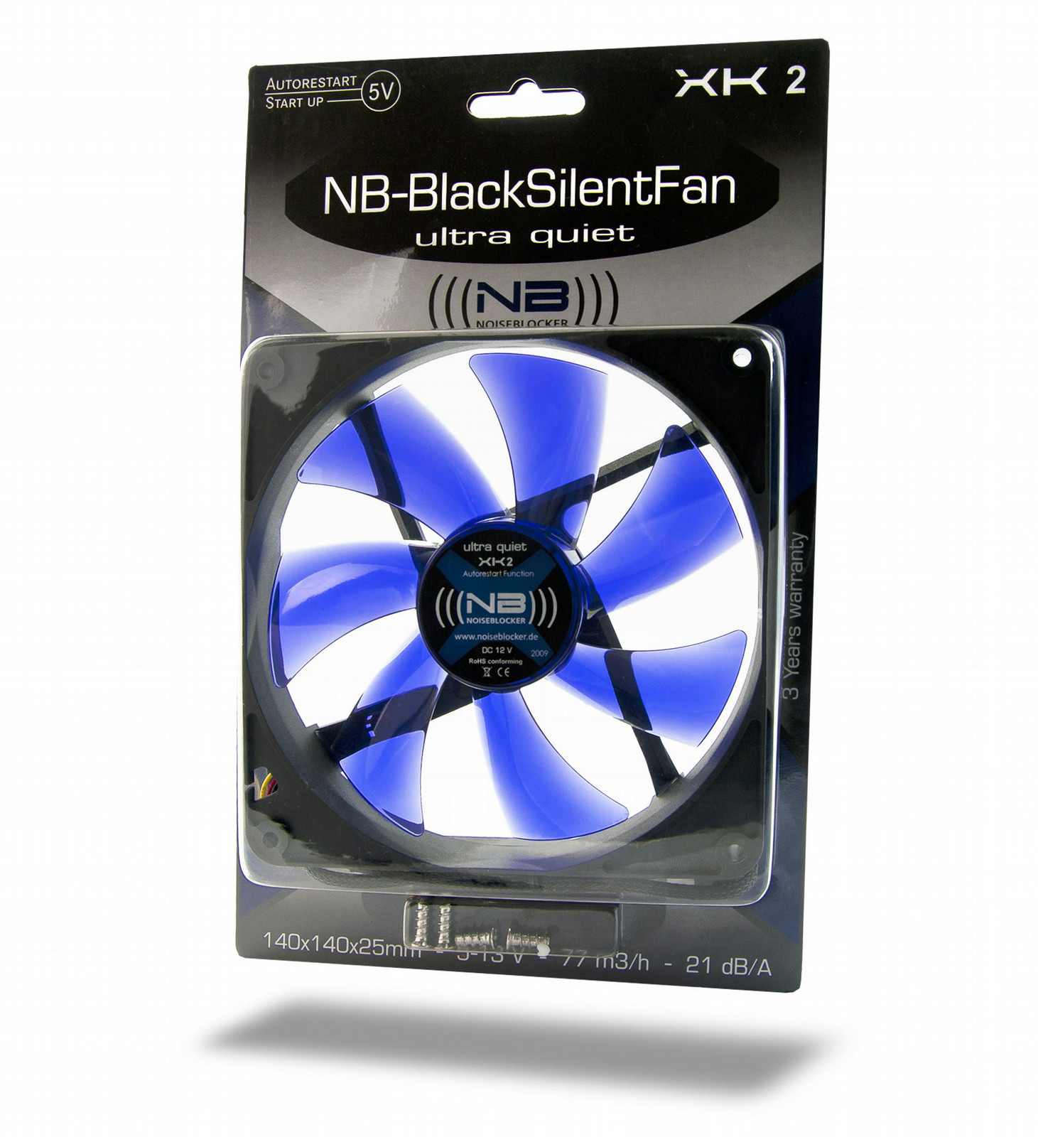 Noiseblocker XK2. Подходит для: Корпус компьютера, Тип: Вентилятор, Уровень шума (высокая скорость): 19,5 дБ. Цвет товара: Черный, Синий, Материал: Пластик. Номинальный ток: 0,10 А, Потребляемая мощность (в обычном режиме): 1,20 Вт. Вес: 135 г. Размеры (ШхГхВ): 140 x 140 x 25 мм, Скорость вращения: 1100 об/мин