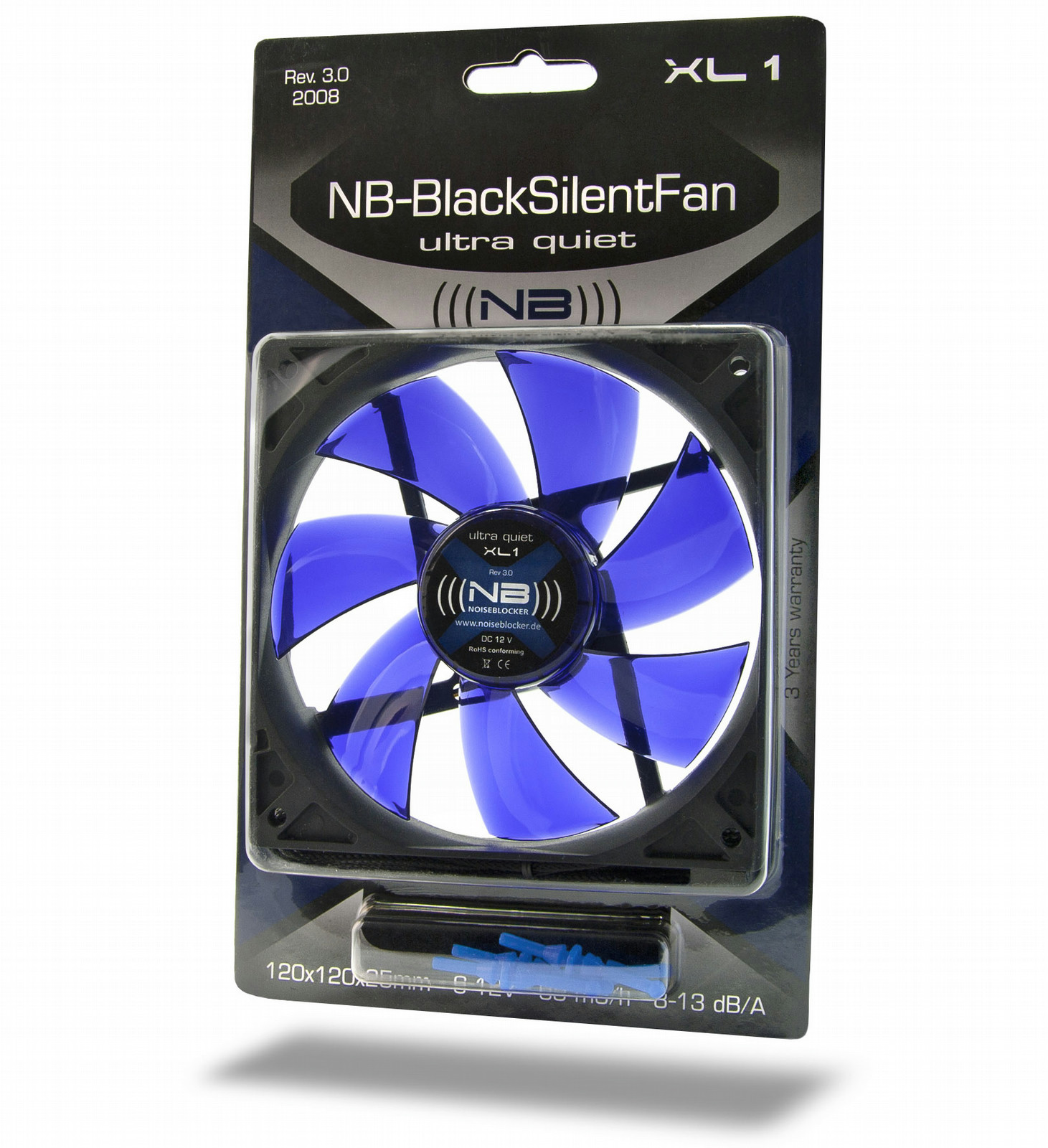 Noiseblocker XL1. Подходит для: Корпус компьютера, Тип: Вентилятор, Уровень шума (высокая скорость): 13 дБ. Цвет товара: Черный, Материал: Пластик. Номинальный ток: 0,08 А, Потребляемая мощность (в обычном режиме): 0,96 Вт. Вес: 120 г. Размеры (ШхГхВ): 120 x 25 x 120 мм, Скорость вращения: 1000 об/мин