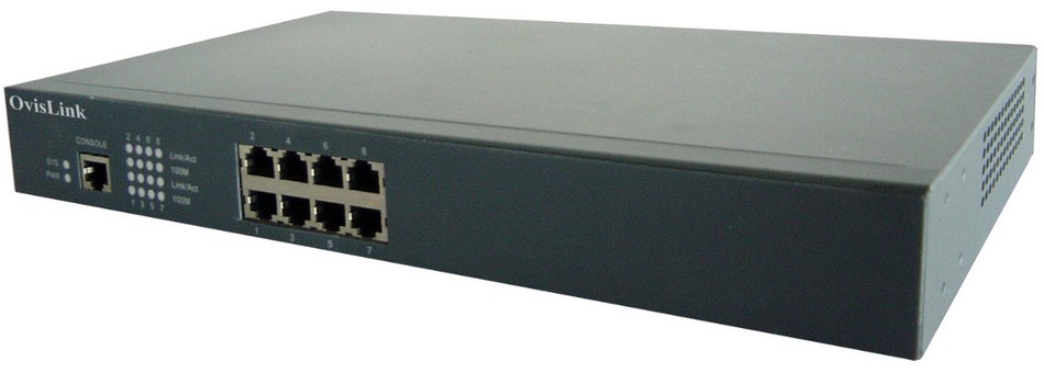 OvisLink OV-2008. Тип свича: Managed network switch, Уровень свича: L2. Тип свивки медного Ethernet: 100BASE-TX,10BASE-T. Стандарты сети: IEEE 802.1D,IEEE 802.1p,IEEE 802.1s,IEEE 802.1w,IEEE 802.1x,IEEE 802.3,IEEE 802.3AB,IEEE 802.3ad,IEE. Размер адресной таблицы: 4000 записей, Коммутационная способность: 3,2 Гбит/с, Поддерживаемые скорости передачи данных: 10/100 Mbps. Алгоритмы шифрования данных: 802.1x RADIUS