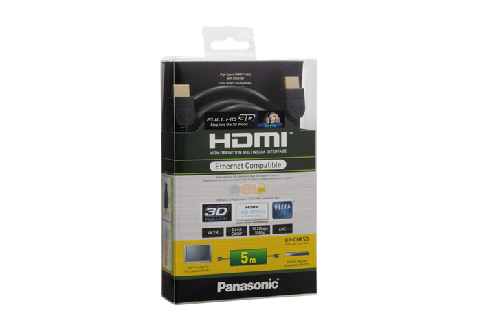 Panasonic 5m HDMI/HDMI. Разъем 1: HDMI, Разъем 2: HDMI, Тип рода: Папа/Папа. Поддерживаемые разрешения: 1080p 4k x 2k