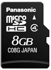 Panasonic RP-SM08GC Carte Micro SD. Емкость: 8 ГБ, Тип флэш-карты: MicroSDHC. Ширина: 11 мм, Глубина: 1 мм, Высота: 15 мм. Скорость передачи: 4 МБ/с, Скорость передачи привода: 10 МБ/с