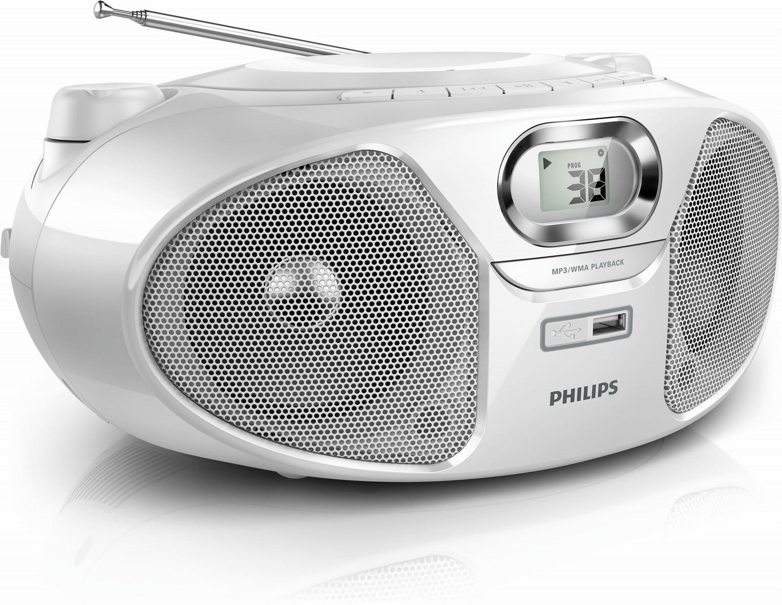 Philips AZ385W/12. Поддерживаемые диапазоны радио: FM. Поддерживаемые типы дисков: CD,CD-R,CD-RW, Режимы воспроизведения: Fast backward, Ускоренная перемотка вперед, Next, Предварительный, Повтор, Произвольный порядок. Номинальная RMS-мощность: 2 Вт. Поддерживаемые форматы аудио: MP3,WMA. Тип дисплея: ЖК