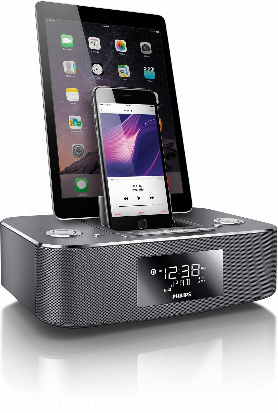 Philips DC395/93. Выходные звуковые каналы: 2.0 канала, Номинальная RMS-мощность: 10 Вт. Порт подключения наушников: 3,5 мм. Совместимость подключения с устройствами Apple: iPad,iPhone, Совместимость: iPad Air, iPad Air 2, iPad mini with Retina display, iPad 4, Compatible with: iPhone 5, iPhone 5C, i, Режимы воспроизведения: Fast backward, Ускоренная перемотка вперед, Next, Pause, Previous. Поддерживаемые диапазоны радио: FM. Дисплей: ЖК