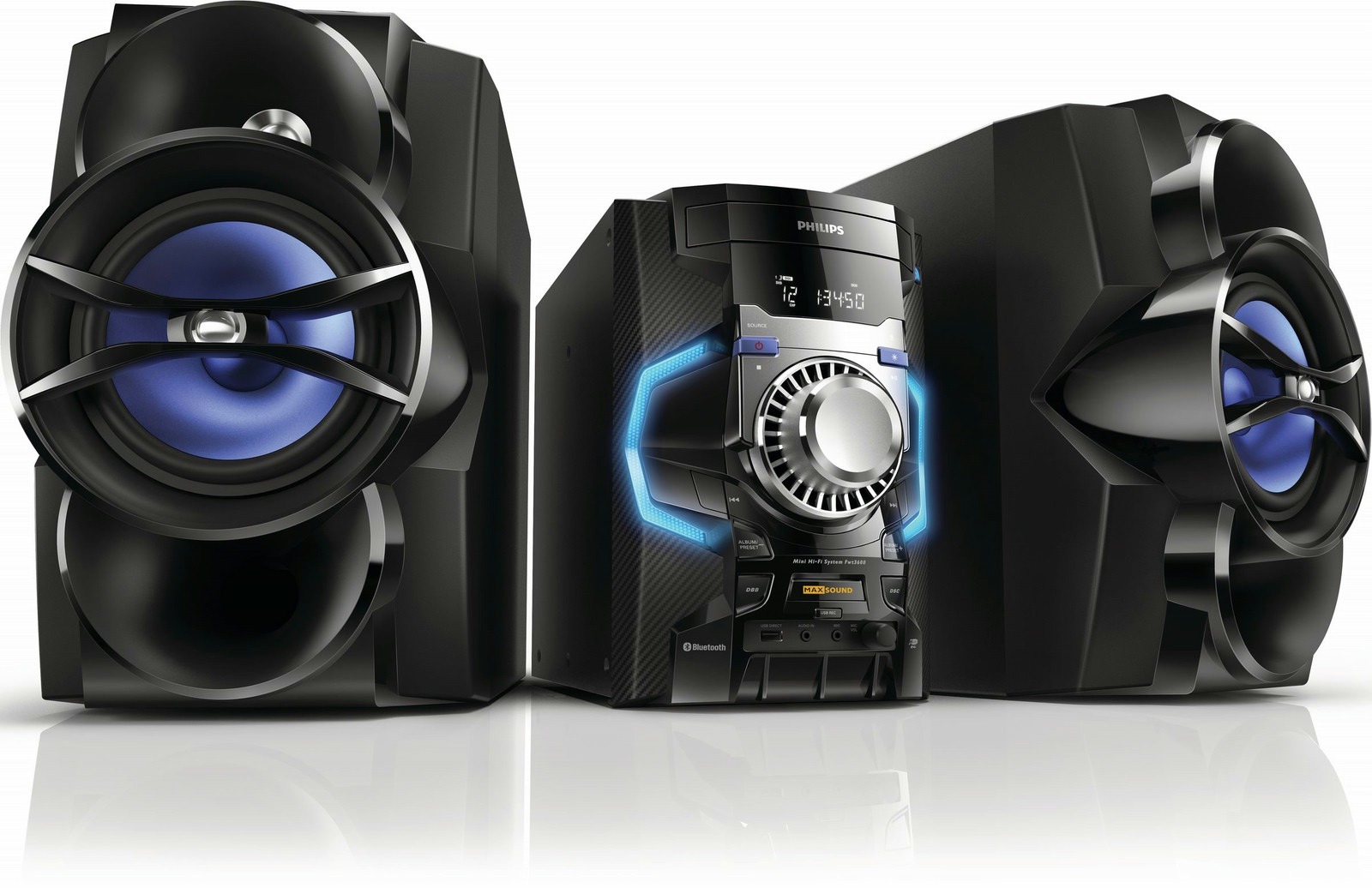 Philips FWT3600X/77. Тип: Home audio mini system, Цвет товара: Черный, Синий, Число дисков: 1 дисков. Номинальная RMS-мощность: 650 Вт, Тип колонок: 2-полосная, Woofer diameter: 16,5 см. Поддерживаемые диапазоны радио: FM,MW, Тип тюнера: Цифровой. Тип дисплея: ЖК. Порт подключения наушников: 3,5 мм, Подключение микрофона: 3,5 мм, Профили Bluetooth: A2DP
