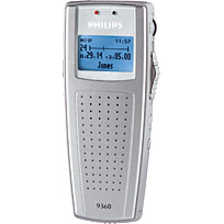Philips Pocket Memo 9360. Максимальное время записи: 15 ч, Диапазон частот: 300 – 6000 Hz. Тип дисплея: ЖК. Тип USB коннектора: Mini-USB B. Вес: 87 г. Минимальный объём ОЗУ: 128 МБ, Минимальный объём жесткого диска: 150 МБ, Минимальный процессор: Pentium III, 500 MHz