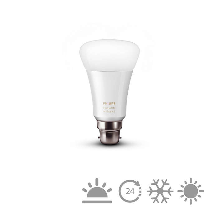 Подключите лампу Philips hue White Ambiance к системе Philips hue и наслаждайтесь естественным белым светом, который помогает проснуться, взбодриться или сконцентрироваться, а также подойдет для чтения и отдыха. Подключите ее к мосту Philips hue и настраивайте освещение на свой вкус.