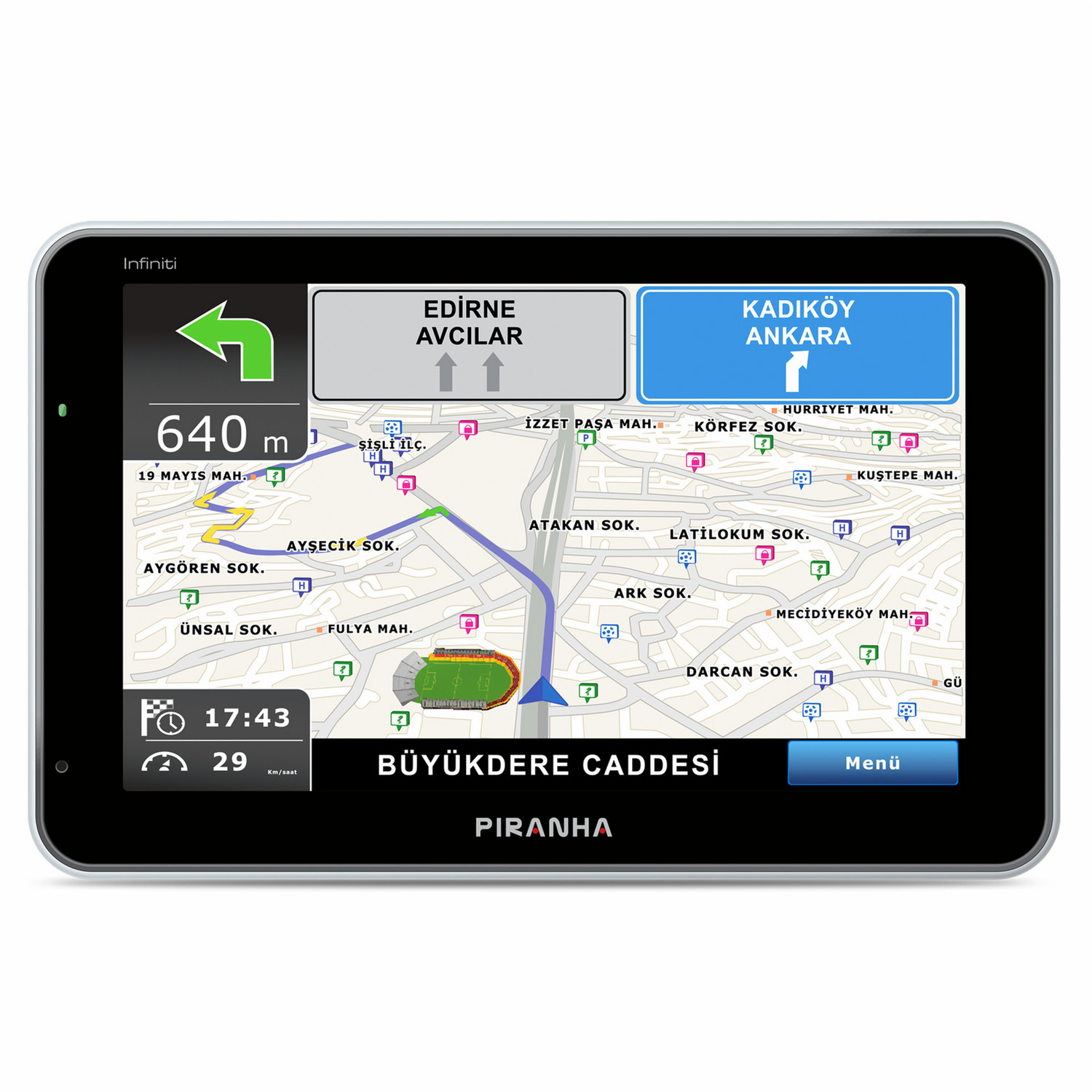 Piranha Infiniti 5.0". Покрытие карты: Турция. Дисплей: ЖК, Разрешение экрана: 800 x 400 пикселей. Тип носителя памяти: Флеш, Совместимые карты памяти: microSD (TransFlash), Тип внутренней памяти: DDR2. Модель процессора: SiRFatlasV. Формат: Портативный, Цвет товара: Черный