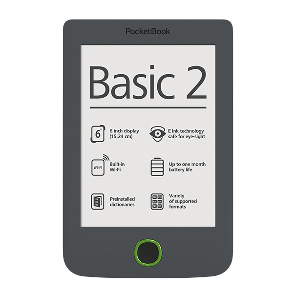 Pocketbook Basic 2. Диагональ: 15,2 см (6"), Технология: E Ink Pearl, Разрешение экрана: 800 x 600 пикселей. Подерживаемые форматы документов: CHM, DjVu, DOC, DOCX, ePub, FB2, FB2.ZIP, HTM, HTML, MOBI, PDF, PRC, RTF, TCR, TXT, Поддерживаемые форматы аудио: Не поддерживается, Поддерживаемые форматы изображения: BMP, JPG, PNG, TIF. Емкость встроенной памяти: 4 ГБ, Совместимые карты памяти: MicroSD (TransFlash), Максимальный объем флеш-карты: 32 ГБ. Тактовая частота процессора: 1000 МГц. Тип интерфейса: USB 2.0, Тип USB коннектора: Micro-USB