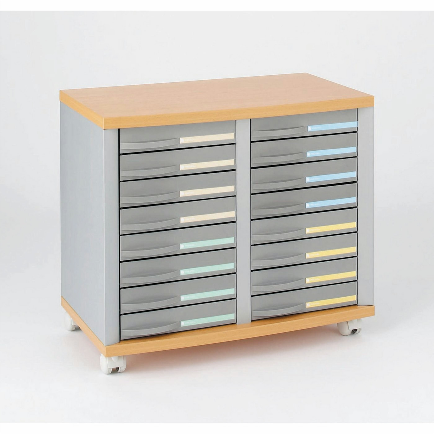 Идеальные для хранения файлов поблизости от рабочего стола шкафы Stratis™ с 16 ящиками представляют собой стильный способ компактной архивации документов. При весе лишь 19 кг и размерах высоких прочных пластмассовых ящиков 8 x 55 мм, расположенных в два ряда, шкафы имеют металлический каркас и прочные деревянные верх и дно. Они легко перемещаются на роликах (с двумя стопорами). В комплекте предлагаются ярлыки разных цветов, помогающие четко маркировать содержимое. Выдерживают вес 40 кг.