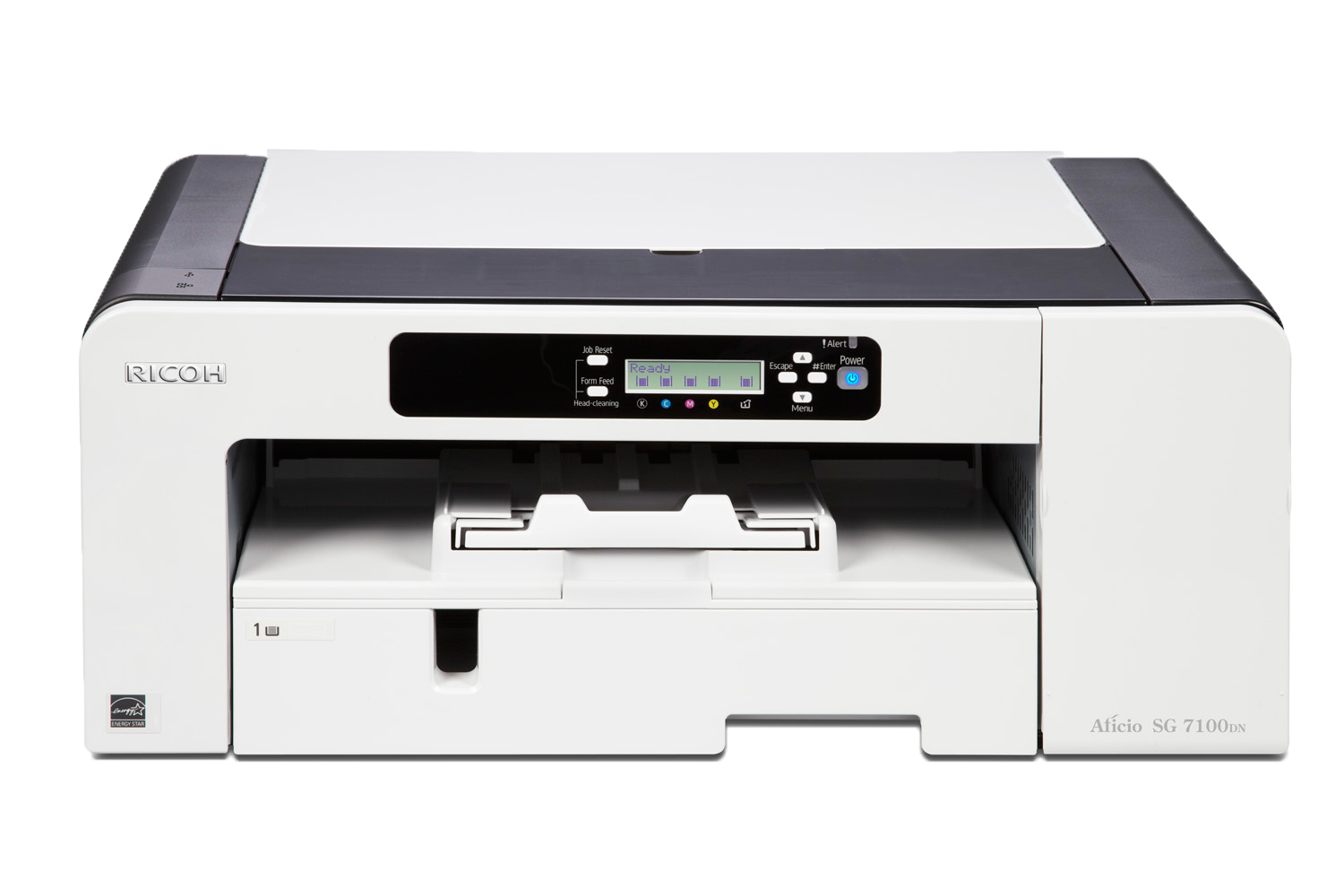 Ricoh SG 7100DN. Месячный рабочий цикл (макс): 10000 стр/мес, Максимальное разрешение: 3600 x 1200 dpi, Стандартные языки принтера: RPCS. Скорость печати (ч/б, обычное кач., A4/US Letter): 29 стр/мин, Скорость печати (цвет., обычное кач., A4/US Letter): 29 стр/мин, Время разогрева: 35 сек. Оперативная память: 32 МБ. Стандартная вместимость на входе: 250 листов, Маскимальная вместимость на входе: 600 листов. Стандартная вместимость на выходе: 100 листов