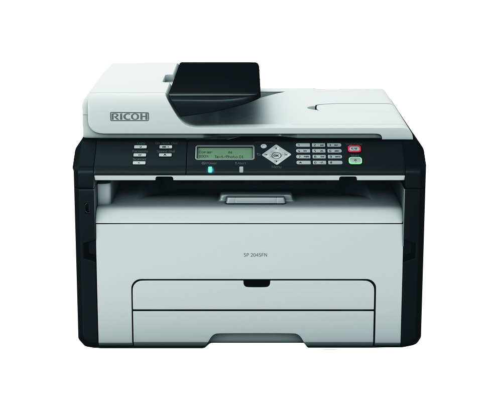 Ricoh SP 204SFN. Технология печати: Лазерный, Печать: Mono printing, Копирование: Mono copying. Скорость печати (ч/б, обычное кач., A4/US Letter): 22 стр/мин, Максимальное разрешение: 6000 x 1200 dpi, Стандартные языки принтера: GDI. Максимальное разрешение копирования: 600 x 600 dpi, Масштабирование копии: 25 - 400%, Максимальное число копий: 99 копий. Разрешение оптического сканирования: 600 x 600 dpi, Максимальная область сканирования: A4 (210 x 297), Сканировать в: Электронная почта, Файл, USB. Скорость передачи факса: 3 с/стор, Скорость модема: 33,6 кбит/с