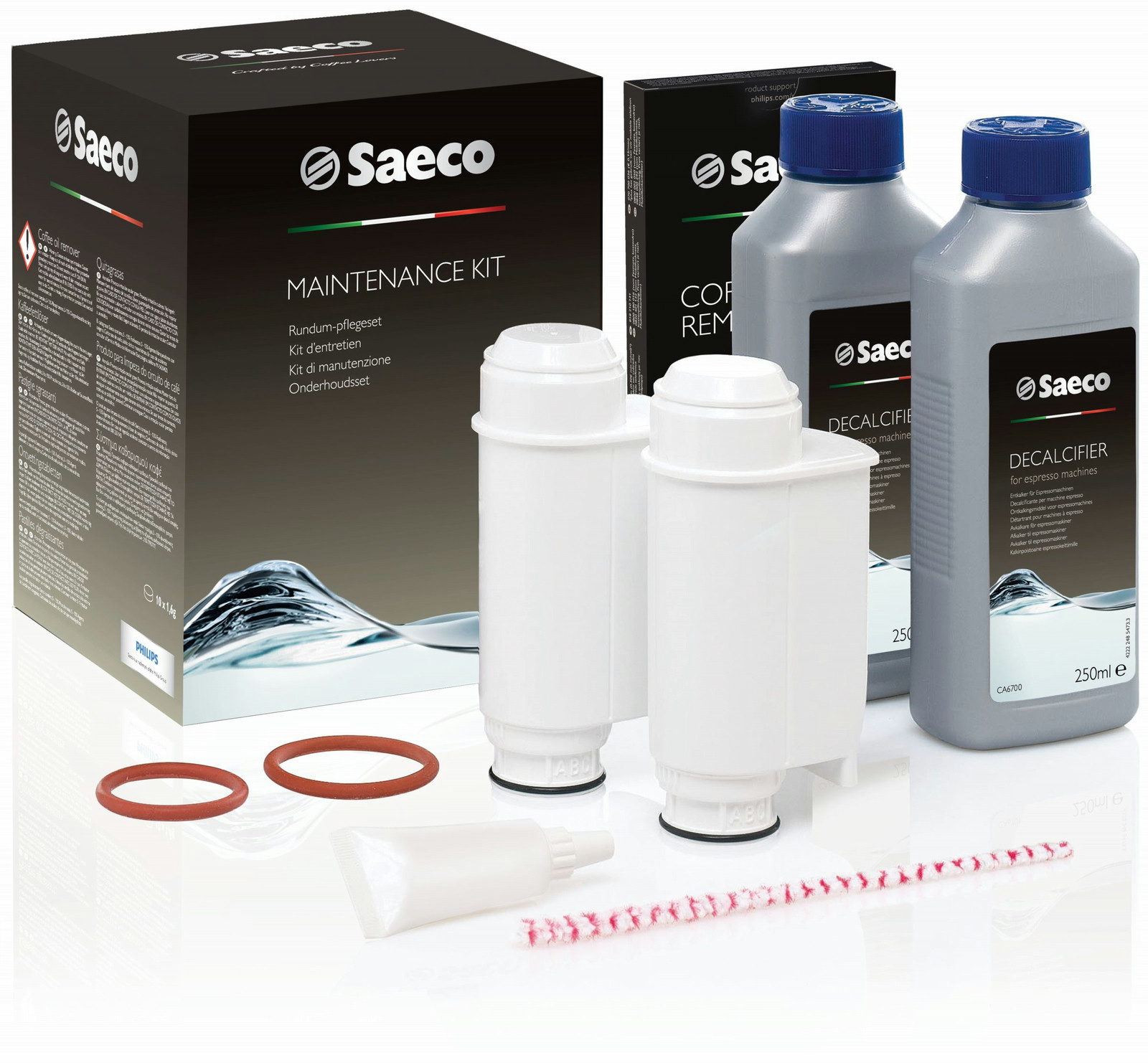 2 Espresso Decalcifier bottles, 2 BRITA INTENZA+ Water filter cartridges, 1 Coffee Oil Remover box containing 10 tablets, 1 Service Kit (including lubricating grease, o-ring gaskets, cleaning brush) |