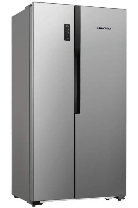 SanGiorgio SB54NFXD. Тип корпуса: Отдельностоящий, Цвет товара: Нержавеющая сталь, Дизайн: Американская дверь. Суммарная полезная емкость: 518 л, Тип климата: SN-ST, Уровень шума: 43 дБ. Полезная емкость холодильника: 339 л, Диапазон температуры холодильной камеры: 0 - 4 °C. Полезная емкость морозильной камеры: 177 л, Размещение морозильной камеры: Сторона, Вместимость морозильной камеры: 11 кг/24ча. Класс энергоэффективности: A+, Потребление энергии: 1,126 кВт·ч/24ча, Годовое потребление энергии: 411 кВт·ч