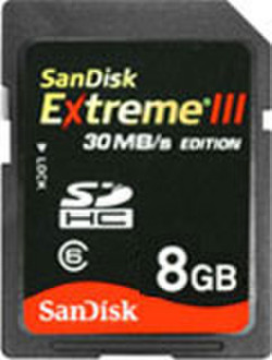Sandisk Extreme III SDHC 8Gb. Емкость: 8 ГБ, Тип флэш-карты: SDHC, Скорость считывания: 30 МБ/с