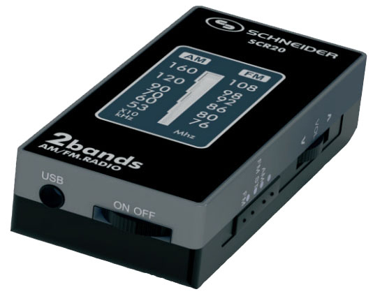 Schneider SCR20. Тип радио: Портативный, Тип тюнера: Аналоговый, Поддерживаемые диапазоны радио: AM, FM. Совместимые размеры батареи: AAA. Размеры (ШхГхВ): 37 x 77 x 18 мм