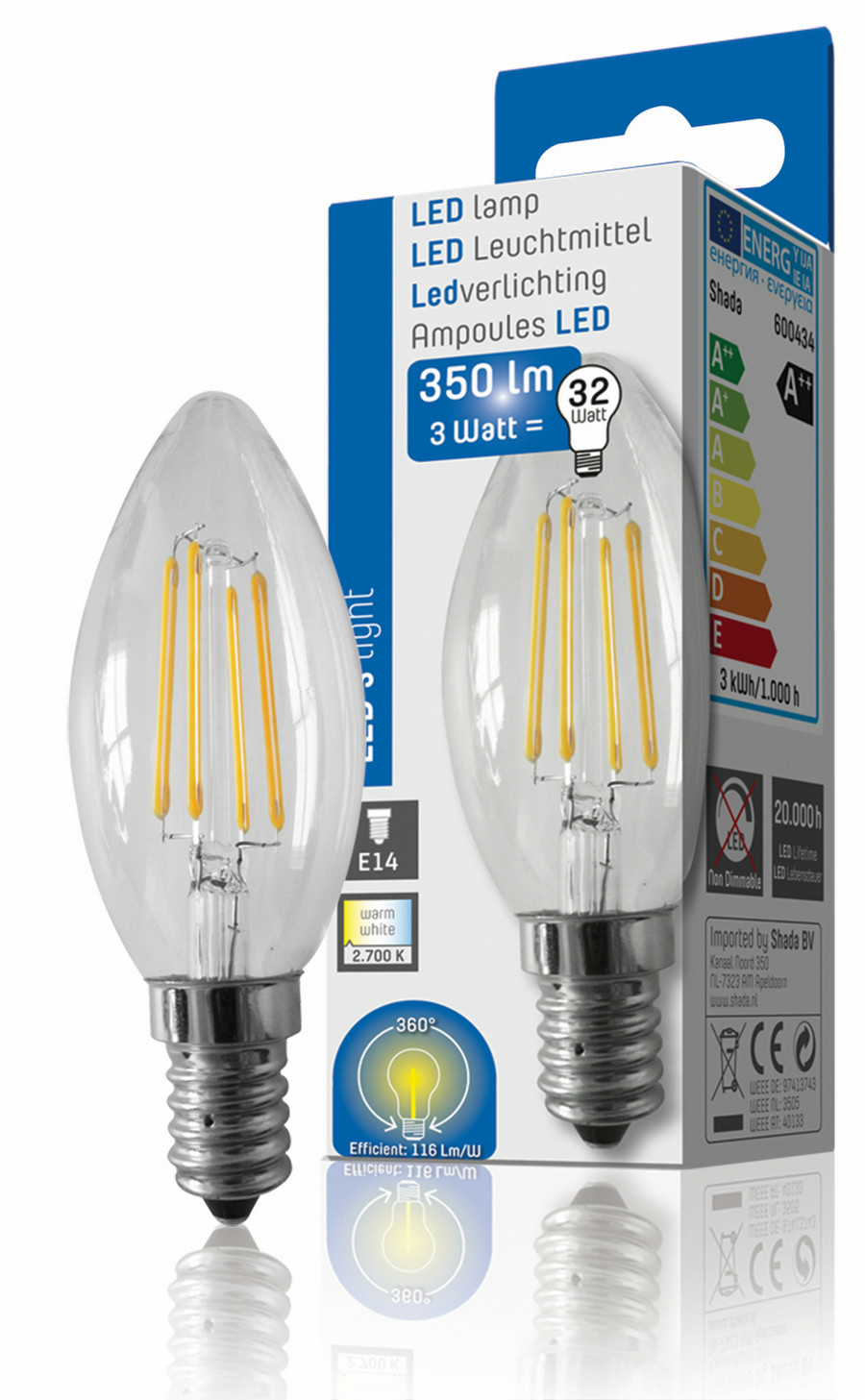 The LED's LIGHT clear LED filament lamp has a warm white color and a beam angle of 360 degrees. The LED chip has a thickness of only 1 mm and thereby it possesses all the features of the incandescent lamp. There is hardly any visible difference. The only difference wich is visible, is the result on your electricity bill with all the benefits that LED technology brings. • Watt: 3.0W