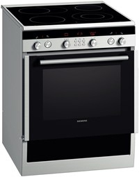 Siemens HC854581. Тип продукта: Отдельностоящий, Размещение контрольной панели: Фронтальный, Материал: Стекло, Нержавеющая сталь. Тип варочной поверхности: Ceramic hob, Тип верхней поверхности: Kерамический, Burner/cooking zone 1 type: Маленький. Oven power source: Электрический, Общий объем духовки(ок): 67 л. Тип таймера: Цифровой. Класс энергоэффективности: A, Входящее напряжение сети: 220 - 240 В, Частота входящего переменного тока: 50/60 Гц