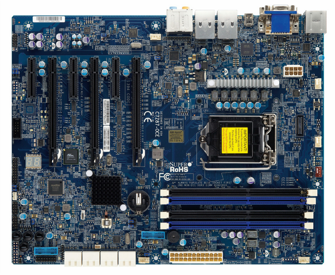 Supermicro C7Z87-OCE. Поддерживаемые типы памяти: DDR3-SDRAM, Тип слотов памяти: DIMM, Поддерживаемые частоты памяти: 1600,2133,2200,2400,2600,2800,3000 МГц. Семейство процессоров: Intel, Совместимые серии процессоров: Core i3,Core i5,Core i7, Сокет процессора: LGA 1150 (Socket H3). Поддерживаемые интерфейсы носителя: Serial ATA III. Контроллер LAN: Intel I210AT,Intel I217V, Тип Ethernet интерфейса: Gigabit Ethernet. Комплектующие для: ПК, Семейство чипсета материнской платы: Intel, Чипсет материнской платы: Intel Z87