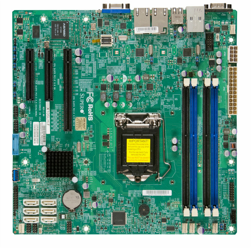Supermicro X10SLH-F. Формат материнской платы: Микро ATX. Производитель процессора: Intel, Сокет процессора: LGA 1150 (Socket H3), Intel Xeon серия: E3-1200. Поддерживаемые типы памяти: DDR3-SDRAM, Поддерживаемые частоты памяти: 1600 МГц, Максимальная внутренняя память: 32 ГБ. Интерфейс жесткого диска: Serial ATA III, Уровни RAID: 0, 1, 5, 10. Чипсет материнской платы: Intel C226