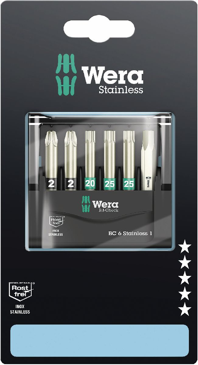 Wera Tools 05073634001. Отвертки/биты с наконечниками в комплекте: Гексагональный, Pozidriv, Звездообразный, Размеры отверток/бит: 2 x PZ 2x50 1 x TX 20x50 2 x TX 25x50 1 x 5.5x50, Материал: Нержавеющая сталь