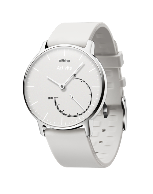 Withings Activite Steel. Тип устройства: Wristband activity tracker, Цвет товара: Белый, Материал корпуса: Нержавеющая сталь. Тип дисплея: Аналоговый. Материал ремня: Силиконовый. Технология подключения: Беспроводной. Поддерживаемые мобильные операционные системы: Android, iOS 7.0, iOS 8.0, iOS 8.2, iOS 9.0