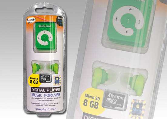 Xtreme 8GB. Тип: MP3. Цвет товара: Зеленый, Регулятор громкости: Цифровой, Светодиодные индикаторы: Статус. Тип носителей для плеера: Flash-media, Полный объем хранения: 8 ГБ, Совместимые карты памяти: MicroSD (TransFlash). Поддерживаемые форматы аудио: MP3. Порт подключения наушников: 3,5 мм
