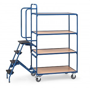 Стальная труба и профиль стальной сварной, с порошковым покрытием. 4 полки из древесных плита, в углу железный каркас лежа, краем 12 мм в высоту. На торцевых сторонах ступеней из дерева, которые поднимают себе холост самостоятельно подает утяжеляет и уверенно стоит на полу, в результате чего автомобиль будет автоматически заблокирован. Защитная дуга для удержания и Опереться. Уровней возникает в состоянии покоя складывания. Высота: 935 мм возникает. 2 поворотных ролика и 2 ролика на кронштейнах, TPE-шины, шариковые втулки с подшипником. Фиксатор на поворотных колеса, в соответствии с Европейским стандартом EN 1757-3 (безопасность платформы тележки). Грузоподъемность верхней и средней погрузочной площадки 80 кг.