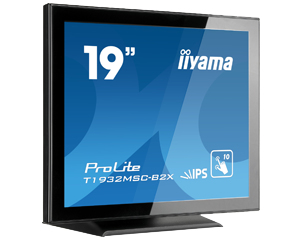 iiyama ProLite T1932MSC-B2X, ProLite. Диагональ экрана: 48,3 см (19"), Время отклика: 14 мс, Яркость дисплея: 250 кд/м². Сенсорная технология: Multi-touch, Мегапиксели: 1,3 МП, Номинальная RMS-мощность: 2 Вт. Поставляемые кабели: Кабель переменного тока, AUX, USB, VGA. Цвет товара: Черный, International Protection (IP) код: IP54, Сертификация: CE, CB, TÜV-Bauart, VCCI, CU, cULus. Угол наклона: -5 - 90°, Крепление VESA: 100 x 100 мм