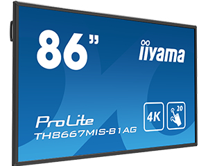 iiyama TH8667MIS-B1AG. Диагональ экрана: 2,18 м (86"), Тип дисплея: LED, Разрешение экрана: 3840 x 2160 пикселей. Версия HDMI: 1.3/2.0. Часы эксплуатации (часы/дни): 24/7, Языки экранных меню: CZE,DEU,DUT,ENG,FRE,ITA,POL,RUS. Цвет товара: Черный, Крепление VESA: 800 x 600 мм, Поддерживаемое размещение: Горизонтально. Номинальная RMS-мощность: 20 Вт